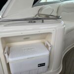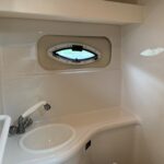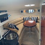 The cockpit has helm seats with space for two people to sit, large chez Lange port side seating, and aft seating area. Icebox, sink and tap to port.