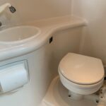 Separate heads compartment has Jabsco manual sea toilet (new 2021), hand basin and shower along with overhead storage.