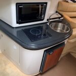 Galley has an electric single-burner hob, 12v fridge with freezer section, sink, microwave, and storage. Spacious galley for a boat of this size.