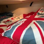 Large V Berth Up forward with a table in the saloon with a sofa convertible to a double. Overhead skylight opening porthole.